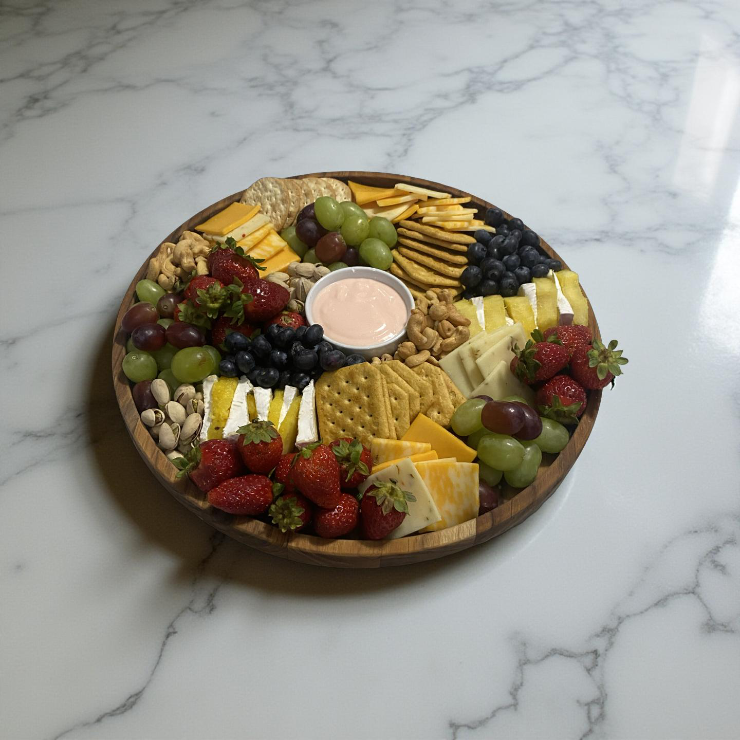 Handcrafted from premium teak wood, this round charcuterie board combines timeless elegance with practical functionality. The naturally durable teak resists moisture and develops a rich patina over time, making it ideal for entertaining. An integrated dip bowl at the center provides convenient serving space for spreads, dips, or olives. Perfect for arranging cheeses, cured meats, fruits, and crackers, this versatile piece transitions seamlessly from kitchen to table. A sophisticated addition to any host's collection.